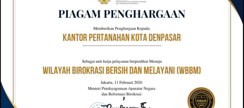 Jakarta – Kementerian Agraria dan Tata Ruang/Badan Pertanahan Nasional (ATR/BPN) kembali menambahkan capaian satuan kerja (Satker) yang meraih predikat Wilayah Birokrasi Bersih dan Melayani (WBBM), yaitu Kantor Pertanahan (Kantah) Kota Denpasar. WBBM adalah predikat yang diberikan kepada unit kerja instansi pemerintah yang berhasil menerapkan Reformasi Birokrasi secara maksimal. Penghargaan itu diraih dalam kegiatan SAKIP dan Zona Integritas Award Tahun 2025 “Transformasi Akuntabilitas dan Integritas menuju Indonesia Emas 2045”, yang diselenggarakan secara daring pada Rabu (11/02/2026) lalu.